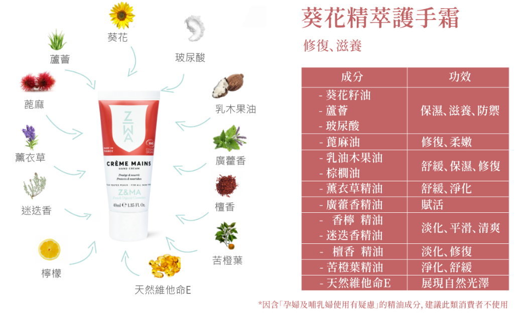 由3種植物油及6種植物精油萃取而成,滋潤修復雙手,保濕舒緩,預防皮膚乾裂。使用後雙手清爽不黏膩。