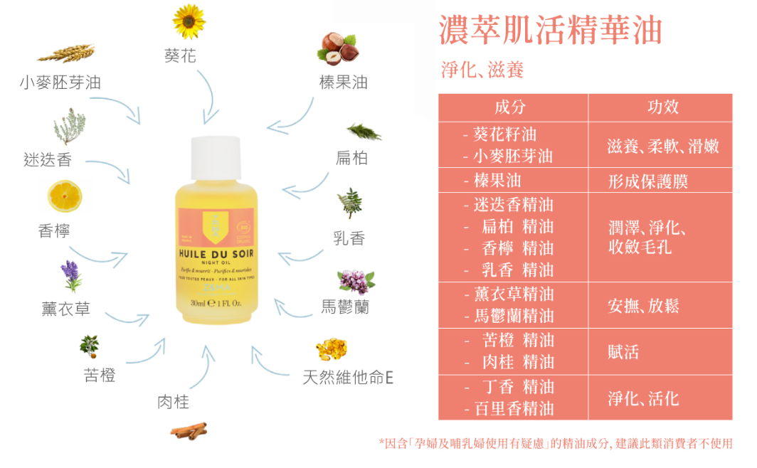 《13種精油+植物油精華》◆天然精油精華萃取◆嫩白活化,改善暗沉◆滋養柔嫩,賦活肌膚◆緊緻舒緩,淨化毛孔◆一覺醒來,由內而外恢復光澤亮麗