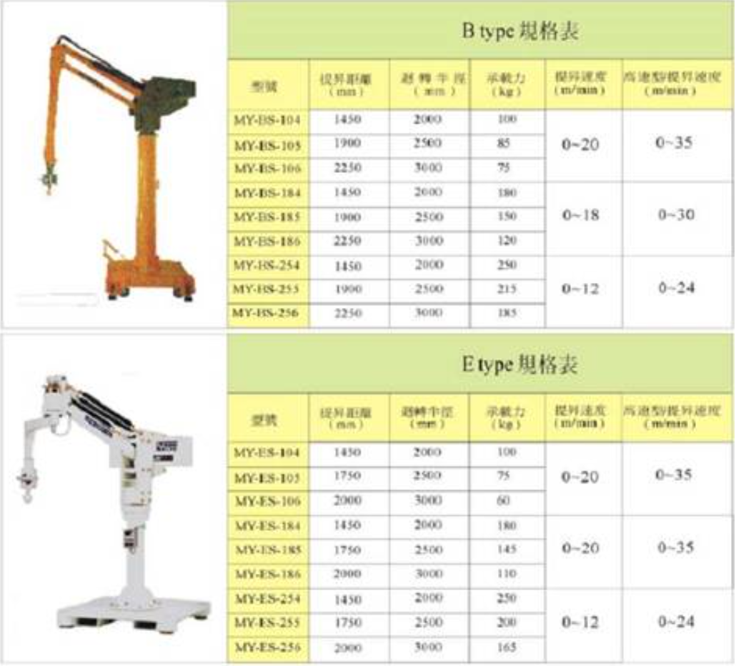 Y-MAN 依照各個不同的型號,其速度與載重能力皆不相同。以下為各個型號的能力,可選用最適當的為所用。